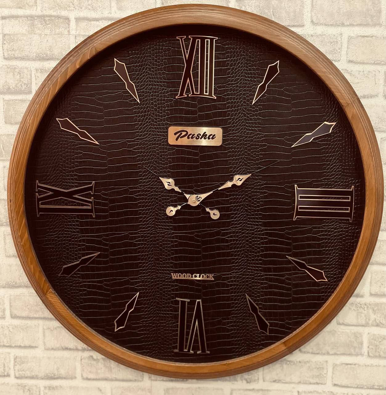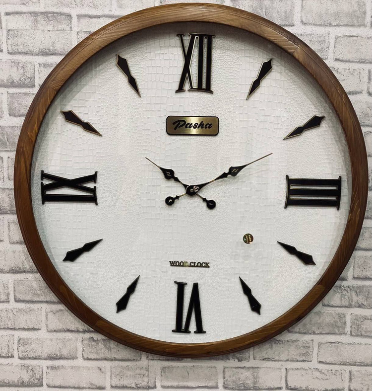 این ساعت از برند پاشا میباشد.برند پاشا به صورت تخصصی برروی ساعت های چوبی فعالیت دارد.چوب ساعت های پاشا تماما چوب نراد روسی با کیفیت و درجه یک میباشد.صفحه این ساعت نیز از جنس چرمی میباشد و اعداد این ساعت ها هم فلکسی درجه یک و براق میباشد.موتور های به کار رفته در این ساعت ها همگی تایوان درجه یک و دارای گارانتی میباشد.