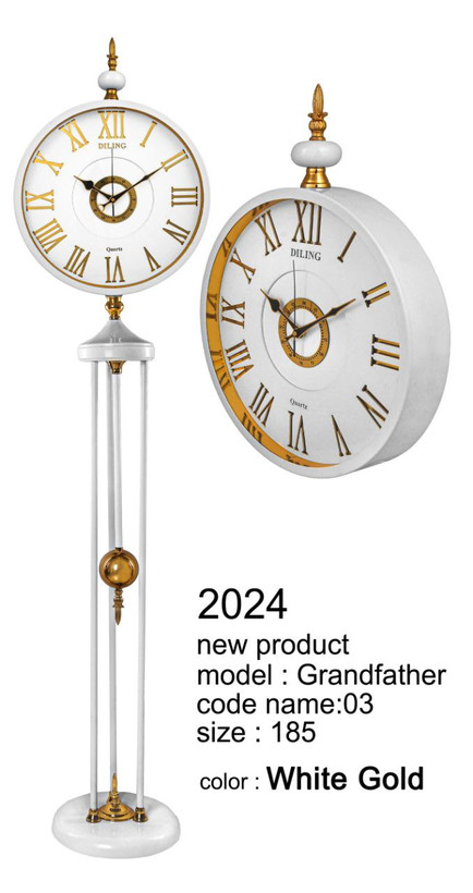 جنس بدنه این ساعت ایستاده تمام فلزی میباشدو این ساعت به صورت تک پایه پاندول دار به بازار عرضه شده است.
