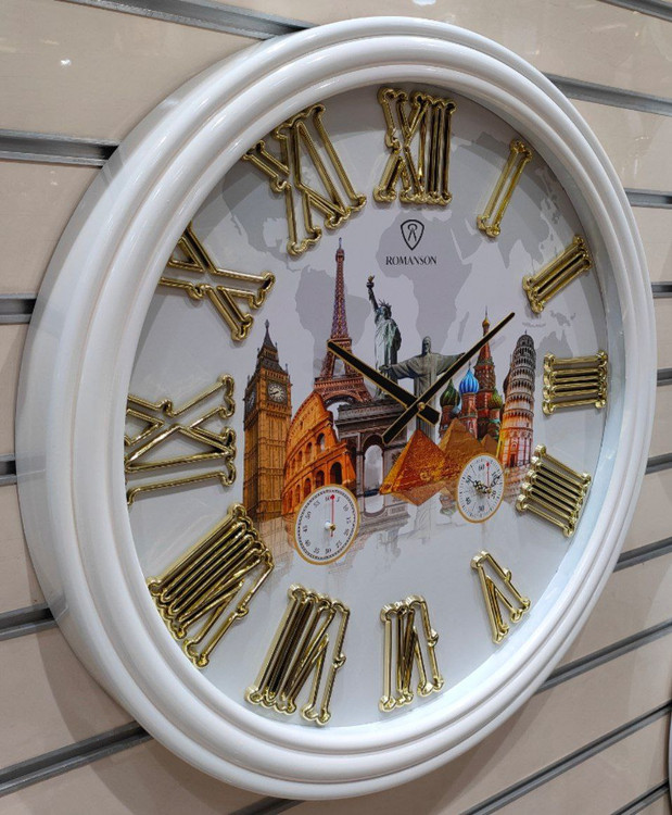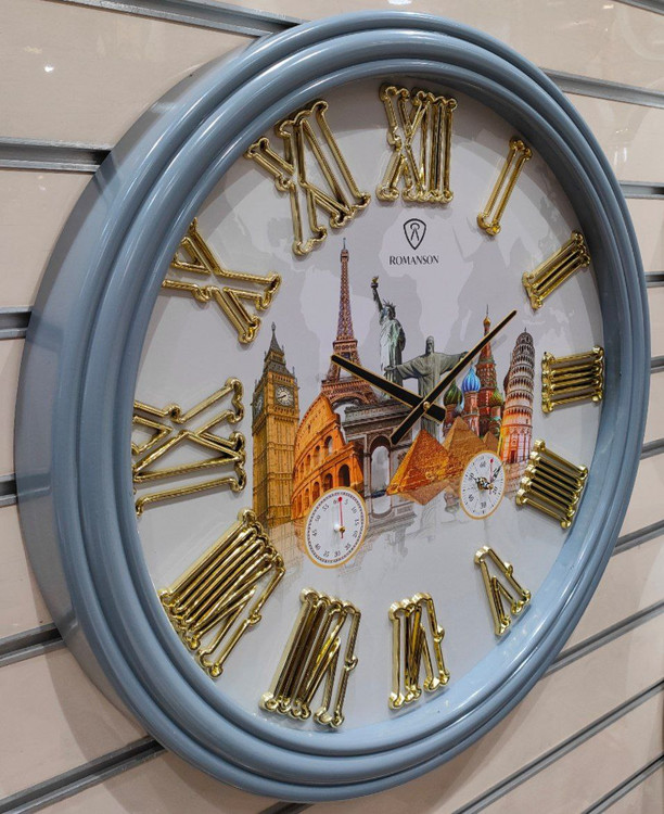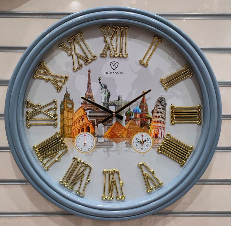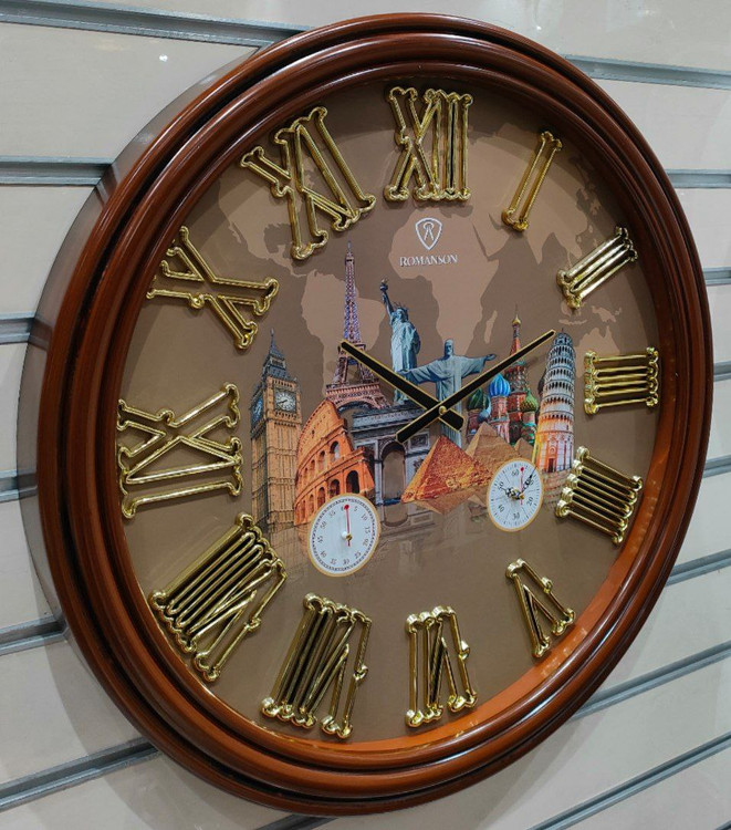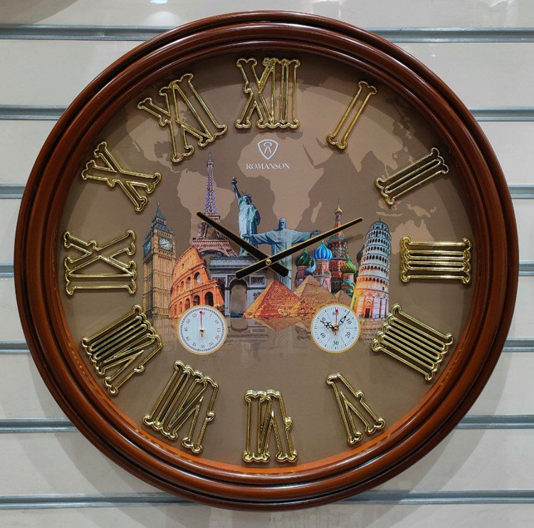 رنگ این ساعت سه لایه پلی استری براق بوده و اعداد آن نیز ابکاری طلایی شده میباشد.اعداد این ساعت یونانی بوده و طرح صفحه آن به صورت اثار تاریخی جهان میباشد